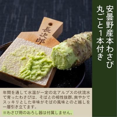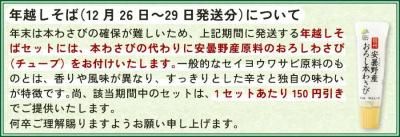 年末は本わさびの確保が難しいため、上記期間に発送する年越しそばセットには、本わさびの代わりに安曇野産原料のおろしわさび(チューブ)をお付けいたします。一般的なセイヨウワサビ原料のものとは、香りや風味が異なり、すっきりとした辛さと独自の味わいが特徴です。尚、該当期間中のセットは、1セットあたり150円引きでご提供いたします。
